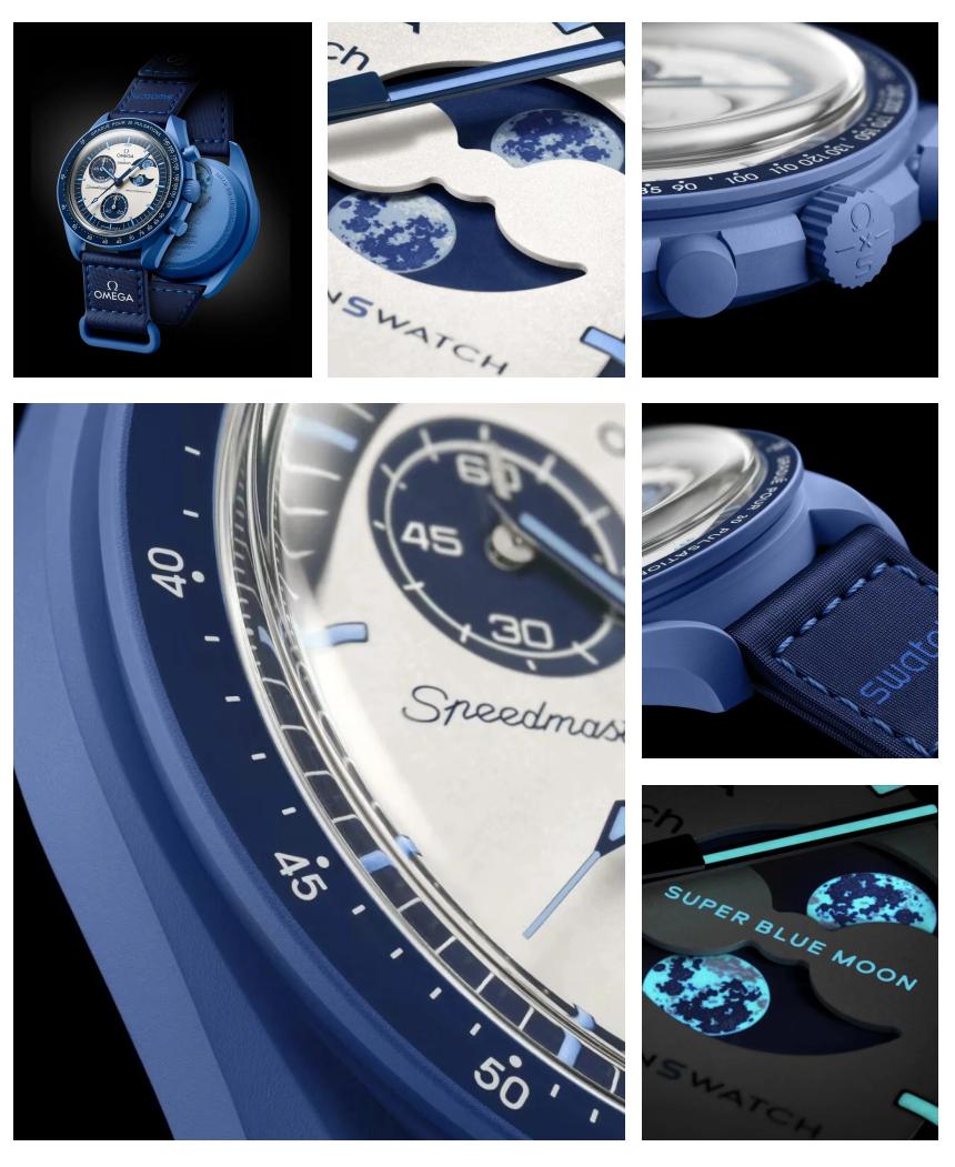 Dial: Blue and moonlight silver-white dial with OMEGA X Swatch brand logo and classic Speedmaster and MoonSwatch logos; inset subdials and hour markers are covered with Grade A Super-LumiNova luminous coating (blue light). Moon phase subdial with moonlight silver-white shield and blue moon phase disc with extra-large full moon. And hidden details drawn with UV ink (blue light). Hands: Hour, minute and chronograph seconds hands tipped with Super-LumiNova (blue light)
