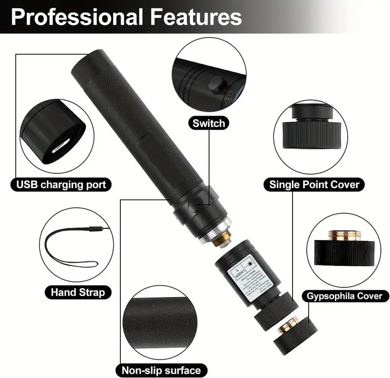 Convenient charging via USB, no need to replace batteries. Powerful laser for maximum visibility Can also be used as a tactical flashlight. Built-in battery for long-term use. Compact and portable design, easy to carry